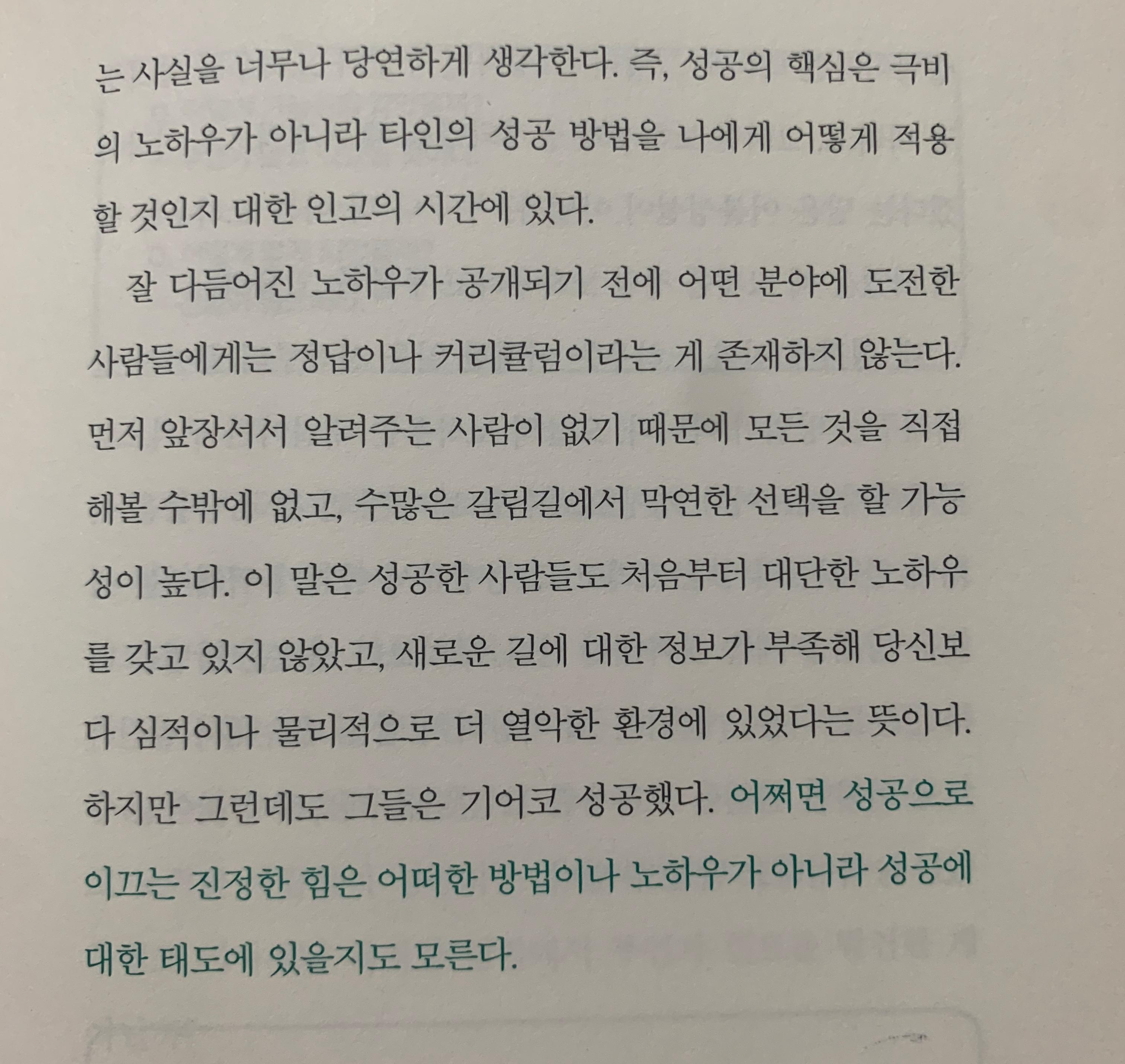 누군가 성공에 이른 방법을 선택하지 않은 사람들은 오로지 그들의 특별함만을 운운하거나 그들의 성공 방법 자체를 부정한다. 누군가의 성공 스토리를 귀담아 듣는 것에 대해 왈가왈부할 입장은 아니지만 정말 성공하고 싶다면 적어도 벤치마킹은 하라고 권하고 싶다. ..... 성공의 핵심은 극비의 노하우가 아니라 타인의 성공 방법을 나에게 어떻게 적용할 것인지에 대한 인고의 시간에 있다. 112p